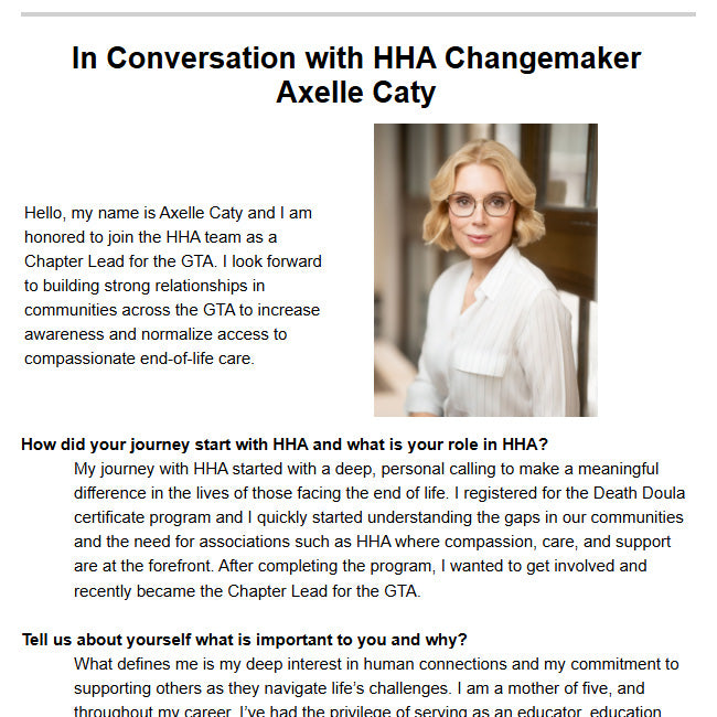 I was recently interviewed for HHA's Community Newsletter and spoke about my new role as the Chapter Lead for the GTA. The interview touches on my journey to becoming a certified Death Doula, the impact HHA has on our community, and my vision for the future of ongoing compassionate end-of-life care.